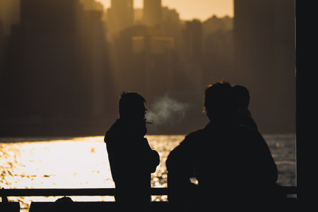 Silhouettes of visitors stand against a golden sunset as a dense city skyline Nov 16 2025