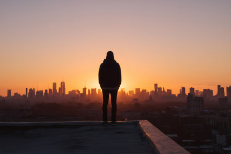 Silhouetted man admiring the breathtaking sunrise over the iconic city skyline from a rooftop perch, embracing urban beauty