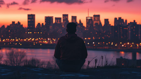 man sitting on a hill, looking out over a city skyline at twilight generative ai