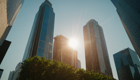 Captivating view of towering buildings under a vibrant sky, showcasing modern architecture and dynamic reflections in sunlight. Perfect for urban themes.