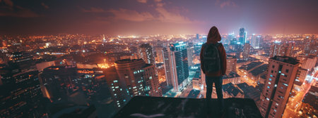 Lone person stands above city lights, gazing at the urban expanse at dusk.