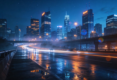 The image captures a breathtaking urban skyline at night, with dazzling lights from skyscrapers reflecting beautifully over a tranquil water surface, conveying peaceful city vibes. AI generated image