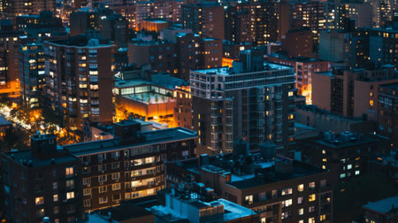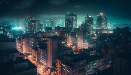 An aerial view of a city skyline at night, illuminated by streetlights and building lights. The skyscrapers rise high into the dark sky, creating a breathtaking view of the urban landscape.