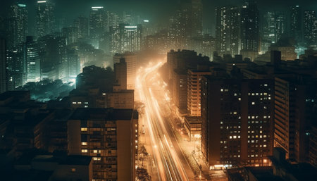 An aerial view of a modern city at night, showcasing a dense network of skyscrapers illuminated by bright streetlights, creating a striking contrast against the dark sky.