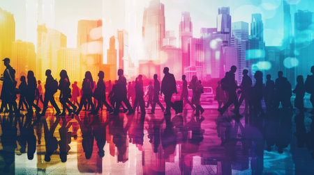 A dynamic silhouette of a diverse crowd walking along a city street, showcasing various ethnicities side by side