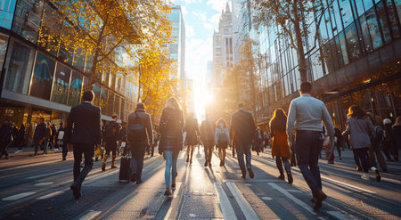 Professionals and pedestrians navigating a busy crosswalk on a vibrant city street, surrounded by a diverse urban crowd