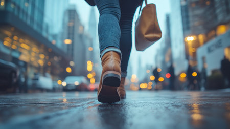 A close-up shot captures the textured rubber of a sneaker's sole as it strides across a bustling city street at twilight, with vibrant city lights and busy pedestria