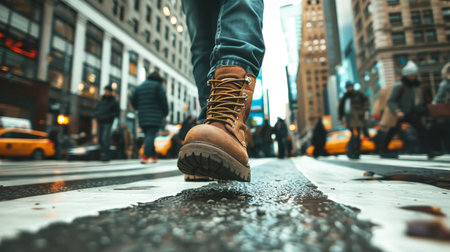 A man with boots walking down a busy city street surrounded by tall buildings and traffic.