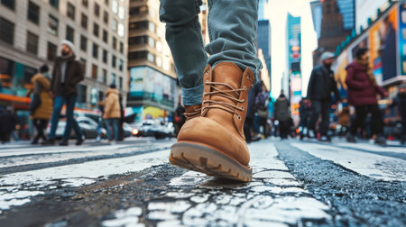 Close-up of a man walking on a city sidewalk, wearing brown boots.