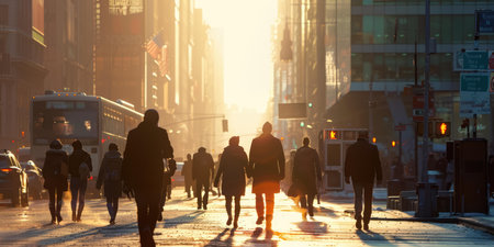 Silhouettes of people walking in a city at sunrise, creating a dramatic contrast between light and shadow.