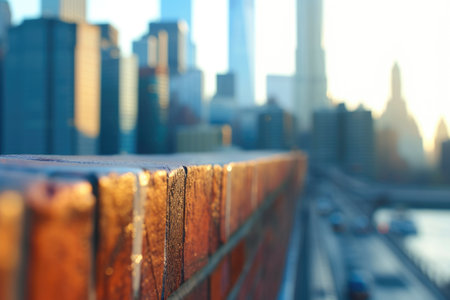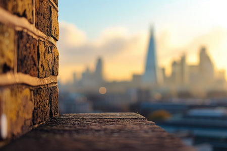 An architectural detail showcases a textured stone building facade in a grayscale composition. The image displays a shallow depth of field, with a blurred cityscape serving as the backdrop. The scene may be suitable for architectural, historical, or conceptual projects. The muted color palette and composition contribute to a sense of timelessness.