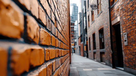 A narrow alleyway framed by textured brick buildings leads to distant skyscrapers. The perspective emphasizes the contrast between old and new architecture in an urban setting.
