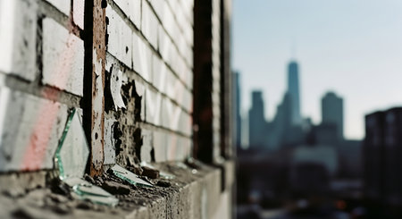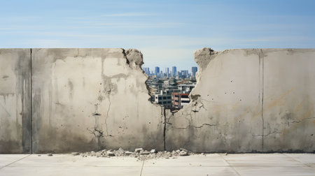 Broken brick wall with cityscape in the background. Concept of destruction.