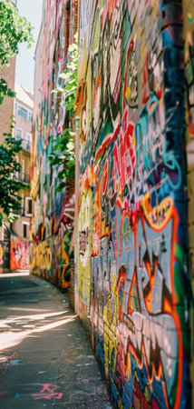 A visually striking mobile photography capture showcasing the vibrant and eclectic graffiti covered walls of a lively urban alleyway featuring a rich blend of colors textures