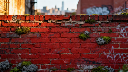 This image features a close-up view of a vintage red brick wall in an urban alleyway. The detailed texture presents a rustic look, complemented by a blurred background.