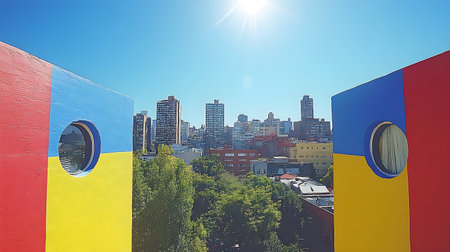 Vibrant colored, textured background with city skyline, ideal for various design projects and commercial applications.