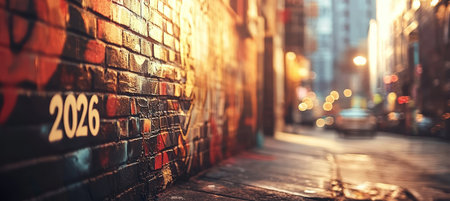 Urban Grunge Alley A 2026 Graffiti Wall and Bokeh Citayscape at Dusk, Blurry City Life Concept