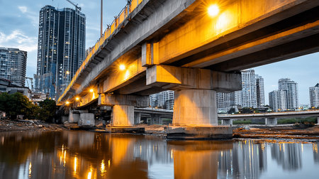 Low-angle shot of a concrete bridge illuminated by warm lights, reflected in the river below. City buildings rise in the background under a cloudy sky, creating an urban landscape.