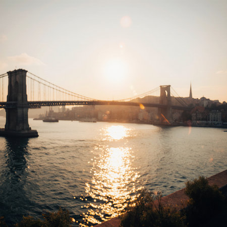 Panoramic view of Brooklyn Bridge at sunset in New York City