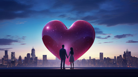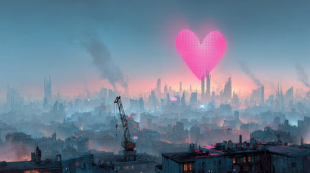 A futuristic city skyline features a large pink hologram heart billboard, glowing in a clean evening sky, perfect for Valentines Day.