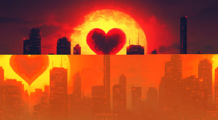 A retro video game-style digital painting of the city skyline at night, with skyscrapers silhouetted against an orange and red sky. In front is a large heart-shaped moon with a dark shadow over it, giving the impression that love has taken its place in this environment. The overall mood should be romantic and nostalgic, reminiscent of classic arcade games from the '80s and '90s. --ar 47:26 --v 6.1 Job ID: 594362cb-632c-434e-9f6c-7f92567946b0