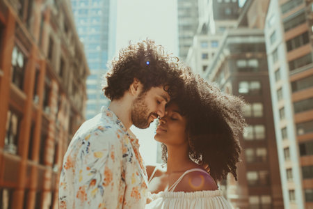 Young couple embracing, smiling, and flirting on city street generated by artificial intelligence