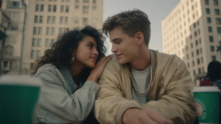An attractive young couple gazing at each other affectionately while sharing coffee cups, with a backdrop of tall city buildings emphasizing their urban environment.