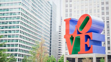 Philadelphia, USA. June 23, 2018. Popular love statue on the skyscrapers background. 16 on 9 panoramic format