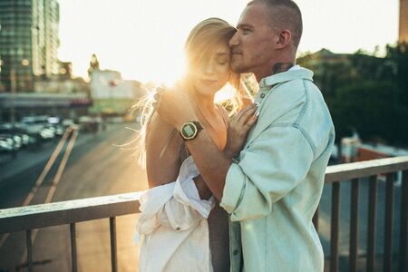 young couple in love. Smiling girl with her boyfriend hugging at sunrise in the city