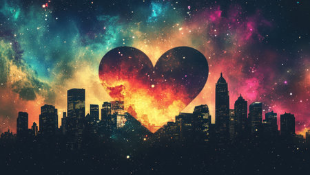 A city skyline silhouette is nestled within a heart shape formed by a colorful cosmic nebula.