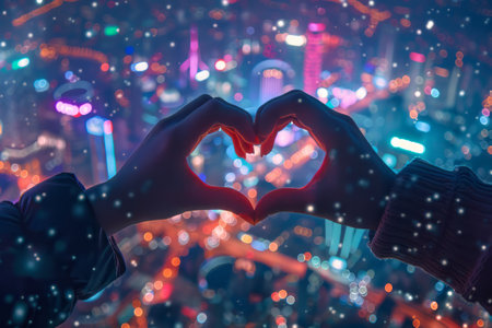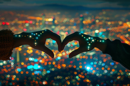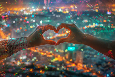 Two hands forming a heart shape against a backdrop of twinkling city lights. High quality illustration