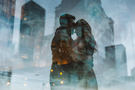 A couple stands closely, their silhouettes illuminated by a colorful city backdrop during dusk.