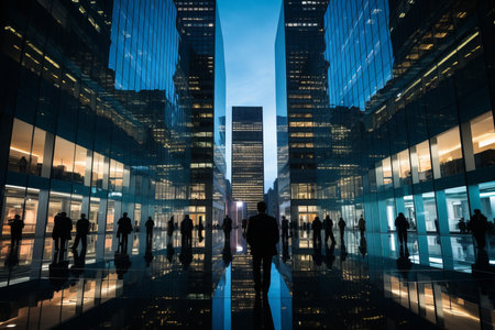 An AI generated illustration of a large modern city building, featuring rectangular windows with reflections of nearby buildings visible in the glass