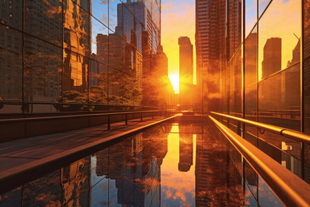 sunrise reflecting off glass skyscrapers in city, created with generative ai