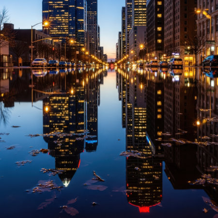 A city street lined with illuminated skyscrapers reflects in a puddle on the ground at twilight, creating a symmetrical and vibrant urban scene.