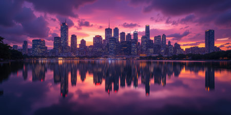 Dramatic urban skyline reflected in perfectly still water, twilight colors of deep purple, orange, and indigo, long exposure effect smoothing