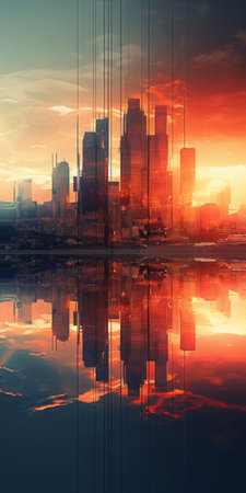 Urban skyline reflection in river at dusk showcasing vibrant contrast colors