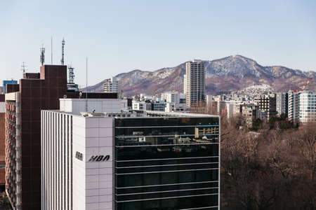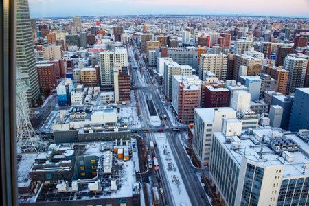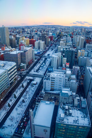 Hokkaido, Japan - December 20, 2022 : Aerial view of cityscape of winter Sapporo, Hokkaido, Japan