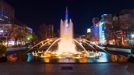 SAPPORO, HOKKAIDO, JAPAN - APRIL 24, 2016: Beautiful West 3 fountain in Odori park and Sapporo TV tower at night.