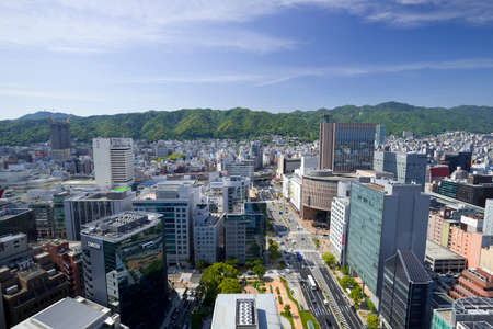 Asia Business concept for real estate and corporate construction - panoramic urban townscape aerial view under bright blue sky and sun in Fukuoka Japan