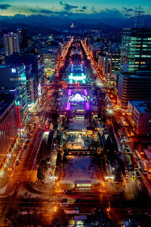 SAPPORO, JAPAN - JAN 28, 2020: Odori Park serves as the main site of the Sapporo Snow Festival event in winter. View from observation deck of Sapporo TV Tower.