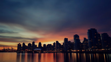 A city skyline is lit up at sunset. The sky is a mix of orange and purple hues, creating a warm and serene atmosphere. The city's lights reflect on the water. AI generated.