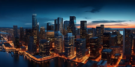 Glowing cityscape with skyscrapers and modern architecture illuminated at dusk generated by artificial intelligence