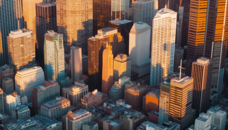 Aerial view of a bustling cityscape with modern skyscrapers and landmarks, bathed in golden sunlight.