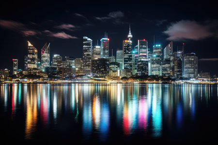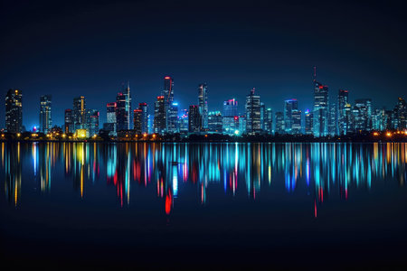 Vibrant city skyline shines under night sky with reflections on calm water surface