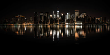A Majestic City Skyline Illuminated at Night, View of a city's illuminated skyline reflecting in a lake, AI Generated