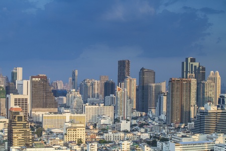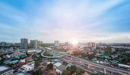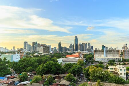 Sunset scence of modern office buildings and condominium in Bangkok city downtown with blue sky and clouds at Bangkok , Thailand. And skytrain