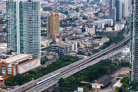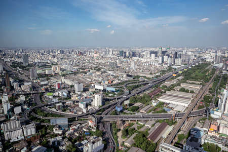 Aerial view of highway street roads in Bangkok Downtown skyline, Thailand. Financial business district and residential area in smart urban city. Skyscraper and high-rise buildings.