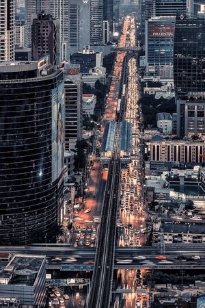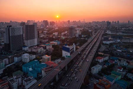 Aerial High angel view of Bangkok downtown highway toll expressway with skyscraper building skylines at sunset dusk. Transportation infrastructure concept.