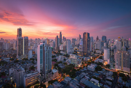 Aerial view of Bangkok Downtown Skyline, Thailand. Financial district and business centers in smart urban city in Asia. Skyscraper and high-rise buildings at sunset.